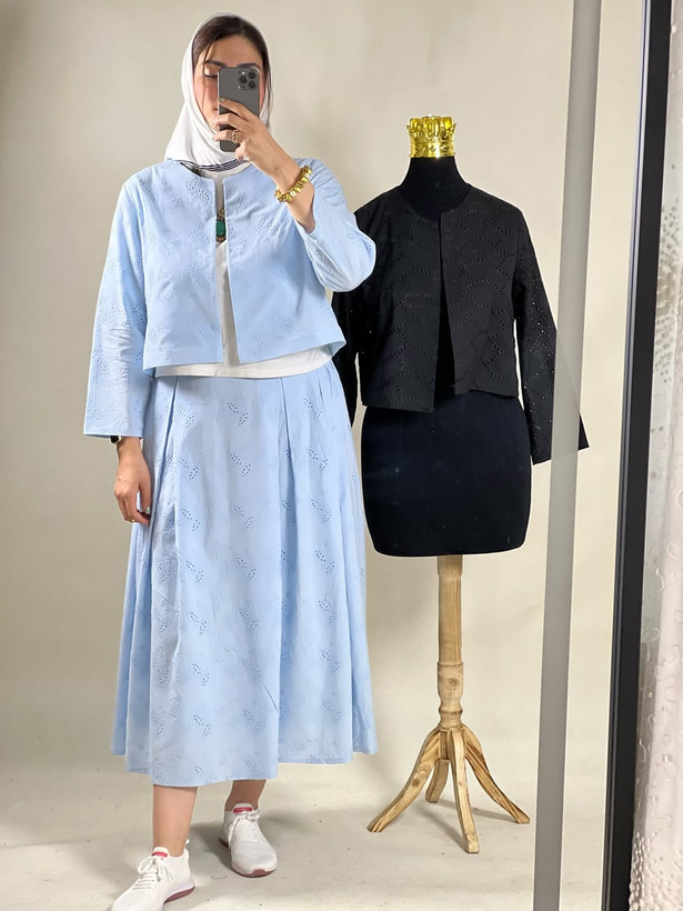 کت و دامن فیروزه کد:۱۱۶۳ رنک دیگه کت و دامن فیروزه با رنگ ترند امسال و البته یکی از قشنگ ترین رنک های دنیا با یه دوخت و کیفیت پارچه بی نظیر جنس گیپور