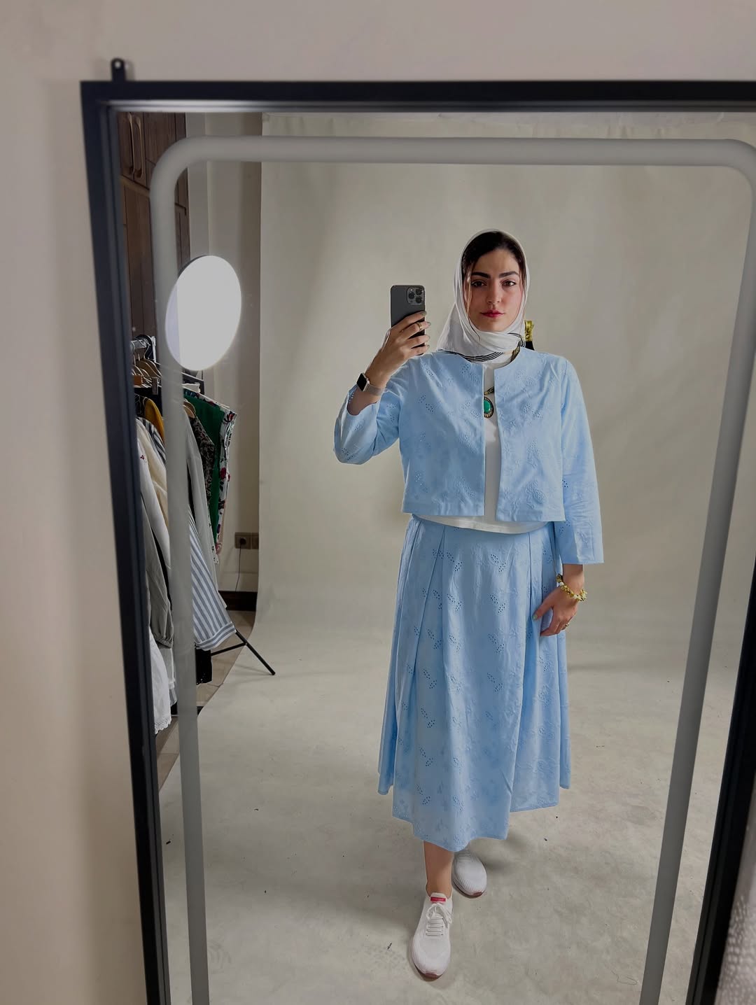 کت و دامن فیروزه کد:۱۱۶۳ رنک دیگه کت و دامن فیروزه با رنگ ترند امسال و البته یکی از قشنگ ترین رنک های دنیا با یه دوخت و کیفیت پارچه بی نظیر جنس گیپور